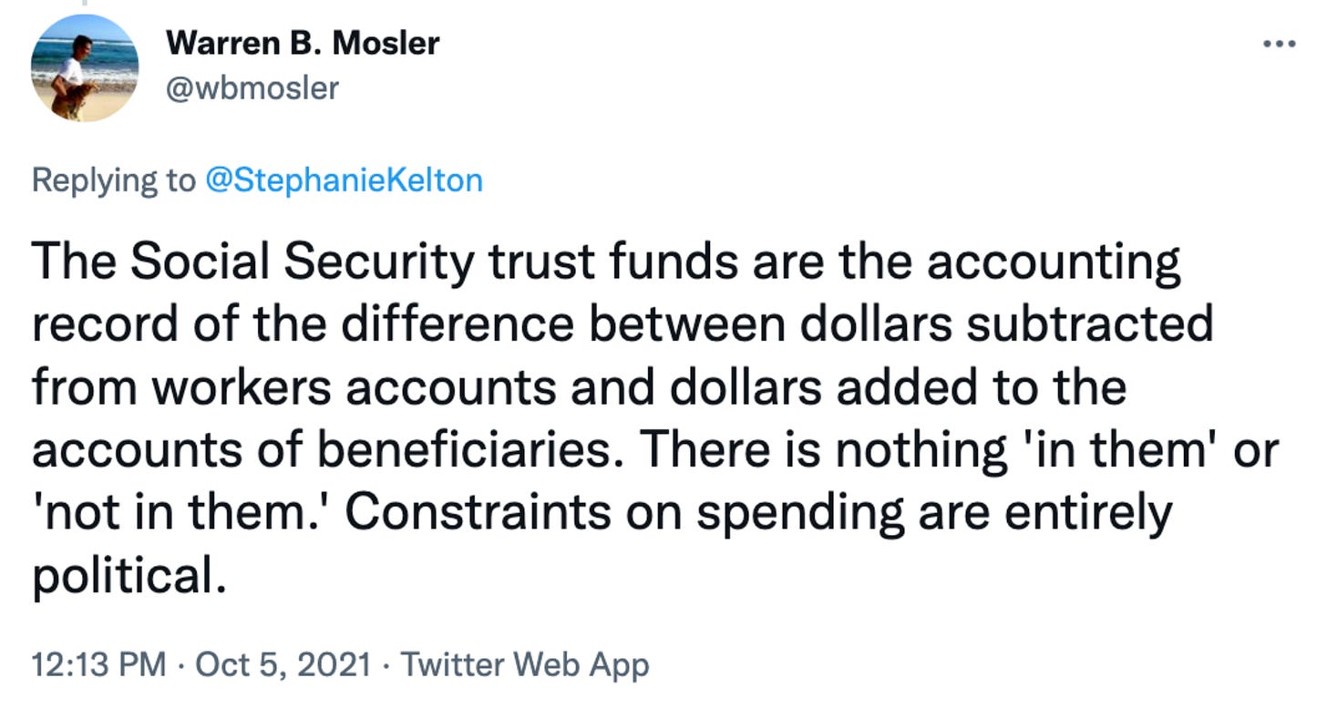 In The Deficit Myth, you point out that much of the fuss about Social Security (and Medicare) stems from the perception that the trust funds out of which Social Security and Medicare payments are made are "running dry." You also observe that while the two trust funds for Social Security and one of the two for Medicare have provisions to the effect that benefits payments can only be made when the funds have a positive balance, the second of the two Medicare funds has no such proviso, meaning that the government commits to making payments from that fund regardless of the balance in the trust fund. The trust funds for Social Security were not necessary for payment purposes; rather, they were part of FDR's strategy for building political support for the program.