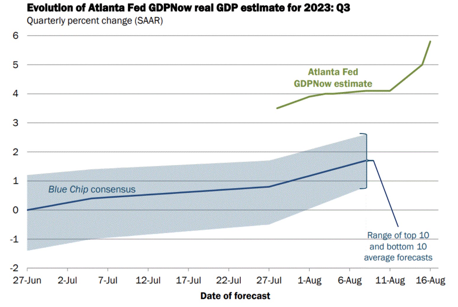 Here’s the latest estimate for real GDP growth from the Atlanta Fed’s real GDPNow model. It has the US economy on track to grow at whopping 5.8 percent in the third quarter of this year. Remember, that’s inflation-adjusted (or real GDP) growth. Yes, it tends to have an upside bias, but it continues to signal robust (and strengthening) aggregate demand.