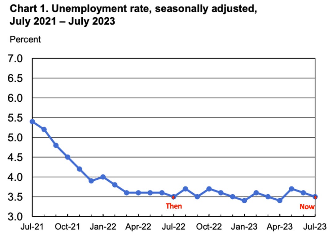 When Powell gave his remarks, the unemployment rate stood at 3.5 percent. As he saw it, the labor market was severely out of whack, with way too many job vacancies relative to the number of job seekers. Powell insisted that the only way to bring inflation down was to deliberately stifle growth and “soften the labor market” (i.e. push the unemployment rate higher). Since then, the Fed has raised its target interest rate from a range of 1.5-1.75 to a range of 5.25-5.50. And where is the unemployment rate today? You guessed it, 3.5 percent.