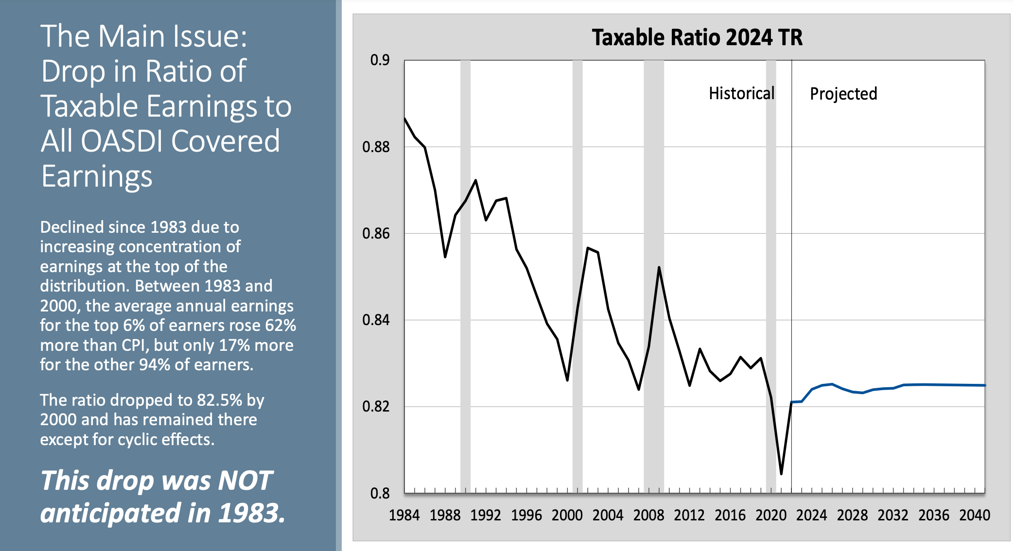 The main issue—what the Greenspan Commission did not see coming—was Elon Musk. Or, more specifically, the “increasing concentration of earnings at the top of the distribution.” As Goss explains: