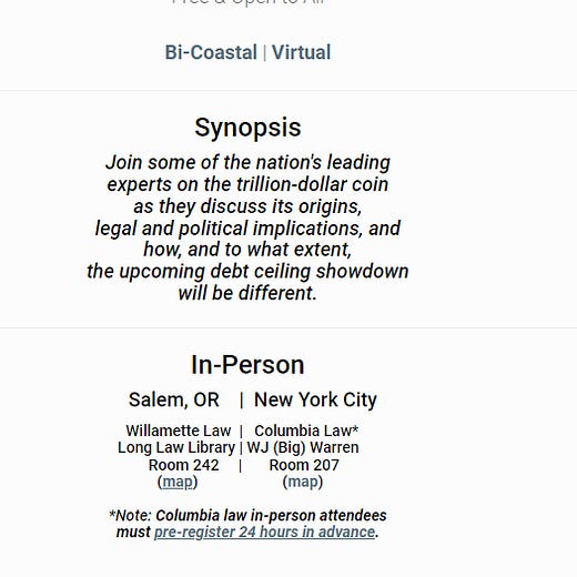 And speaking of the debt ceiling, I’ll be doing a live event at Columbia Law School on January 23 to talk about one of the potential solutions to the problem. And, yes, it involves platinum. If you’d like to attend in person—in New York or Oregon—you’ll need to register at least 24 hours in advance. You can do that here. If you can’t attend live, but you’d like to hear the conversation, you can watch the livestream.