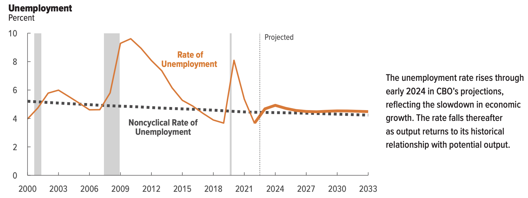 As growth grinds to a halt, CBO predicts that “conditions in the labor market deteriorate” with unemployment rising to 5.1% by the end of this year and continuing to rise into early 2024.