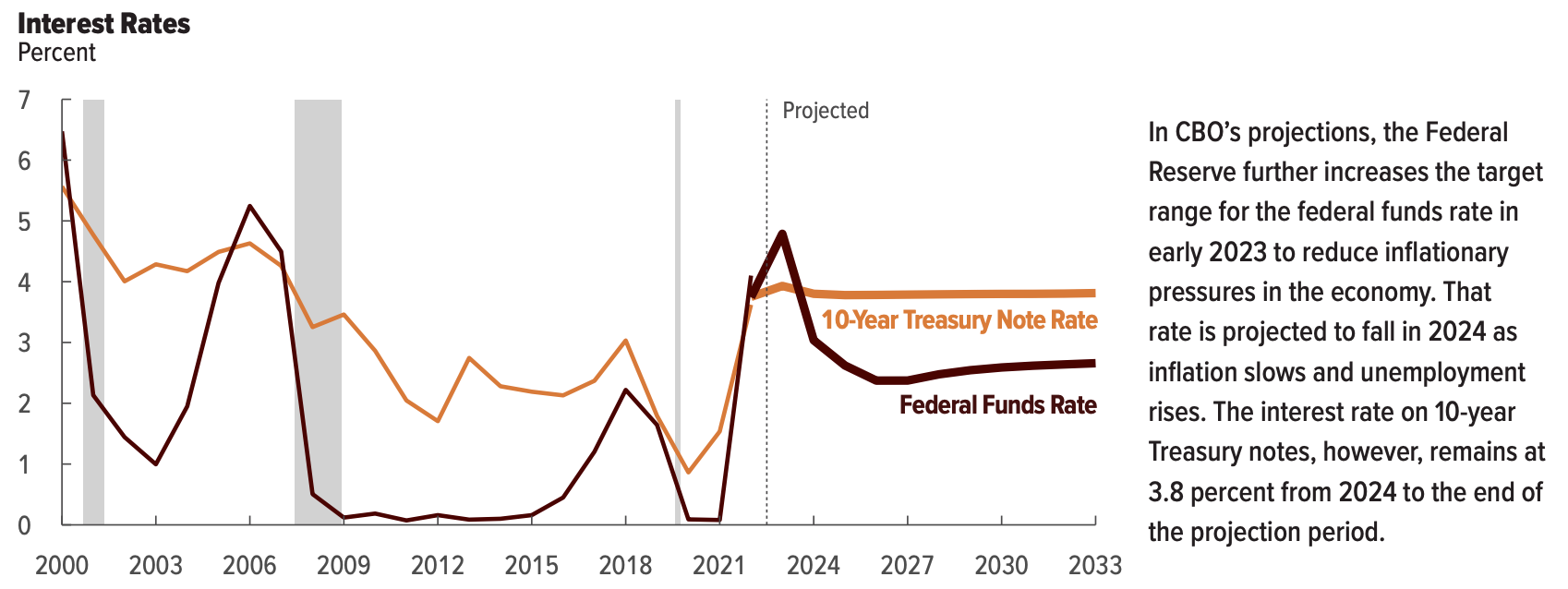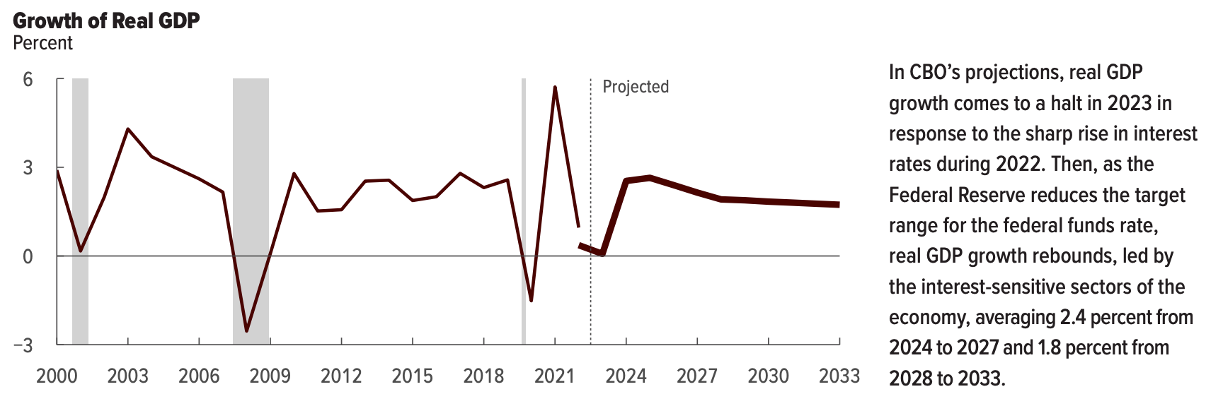In response to the economic slowdown, CBO predicts that the Fed will begin cutting interest rates sometime in 2024, several years before inflation returns to the Fed’s long run target.