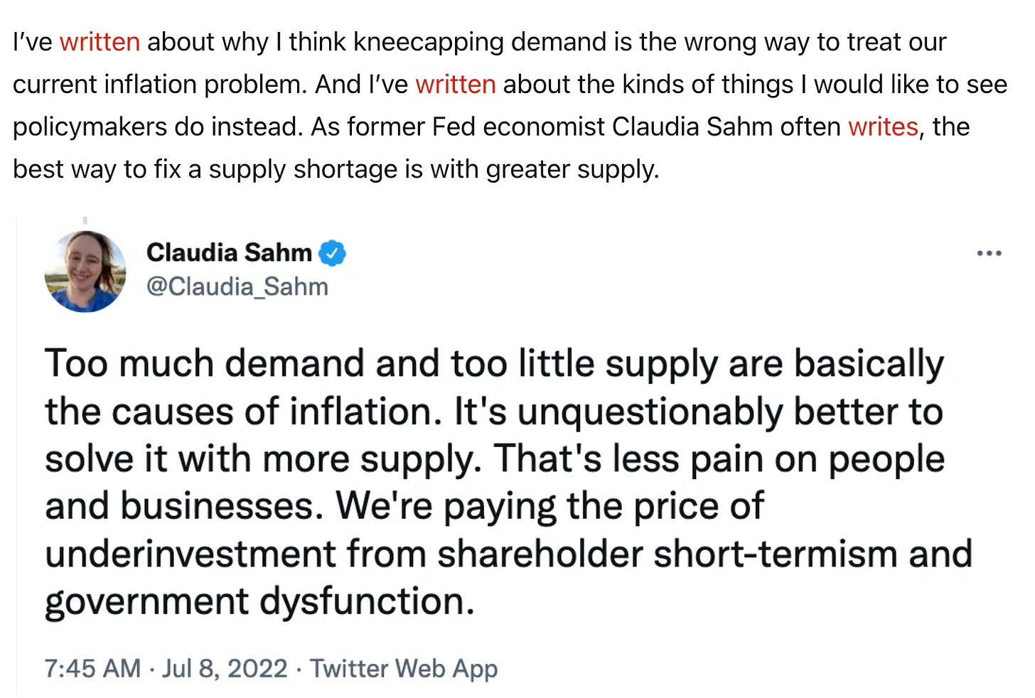 If you’ve been reading The Lens for the last year or so, then you can probably anticipate at least part of my reply. As I’ve argued on countless occasions (here, here, here, here, here), the best way to rein in inflation is to unleash a suite of policies, tailored to address the specific drivers of our current problem. Choosing the right remedy requires correctly diagnosing the source(s) of the problem. Higher taxes might be a smart way to alleviate inflationary pressures. But raising taxes to fight inflation once it becomes a problem has never been “the remedy MMT calls for.”
