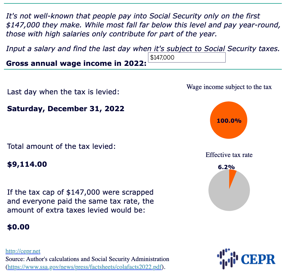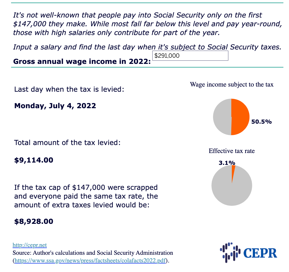 Today, absurdly and unfairly, there is a cap on income subject to Social Security taxes which is just $147,000 a year. That means that if you’re a multi-billionaire you pay the same amount into Social Security as someone making $147,000 a year.