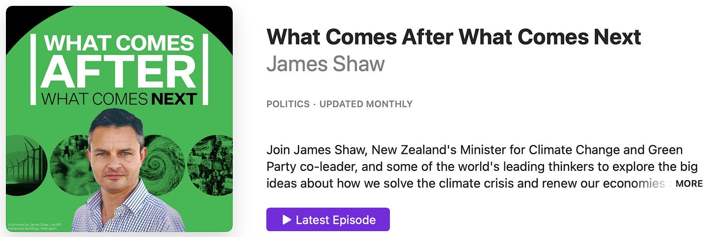 I recently sat down with New Zealand’s Minister for Climate Change, James Shaw. In addition to serving in parliament, Shaw hosts a podcast called What Comes After What Comes Next.