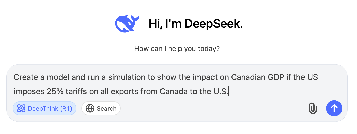 So there you have it. According to Deepseek, the tariffs could shave as “little” as 1.7% or as much as 8% off of Canada’s GDP, with the baseline estimate around 4%. That’s roughly in line with the Bank of Canada’s projection. I wonder how long it took the staff at the BoC to come up with their figures. It took Deepseek about 12 seconds.