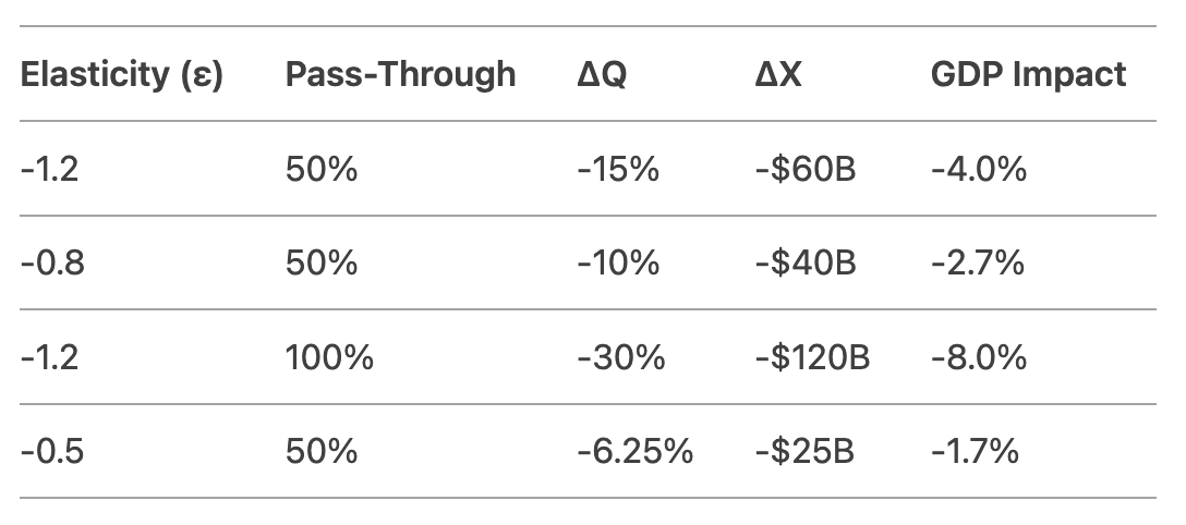 In conclusion, the model would estimate a GDP decrease in the range of 1.2% to 8% depending on elasticity and pass-through assumptions, with a baseline around 4%. However, these are rough estimates and the actual impact would depend on multiple factors including policy responses, market adjustments, and global economic conditions.