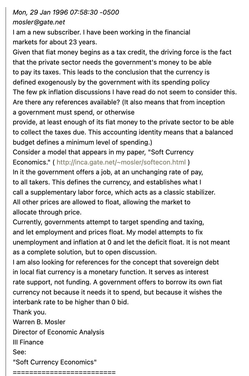 It’s hard for me to wrap my head around it, but MMT is 28 years old today. The collection of ideas at the core of this macroeconomic framework wouldn’t come to be known as “MMT” until much later, but the impetus for what has become the most robust challenge to orthodox economics in my lifetime can be traced to this comment from Warren Mosler, which appeared on the Post Keynesian Thought (PKT) list-serve on January 29, 1996.