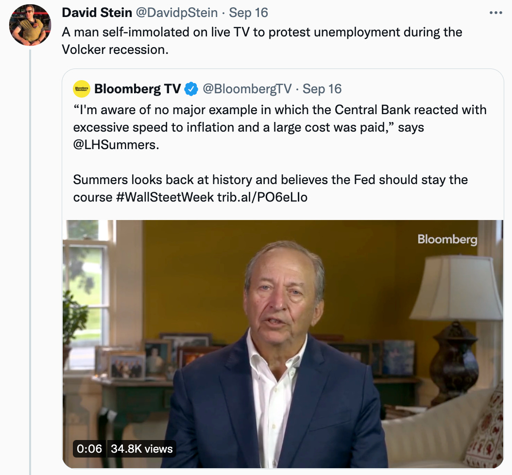 For more than a year now, Larry has flogged the Fed for being too slow to remove the punch bowl. Now that they’ve “fallen behind the curve,” Summers insists that Powell & Co. must make up for lost time by jacking interest rates—and unemployment—way up.