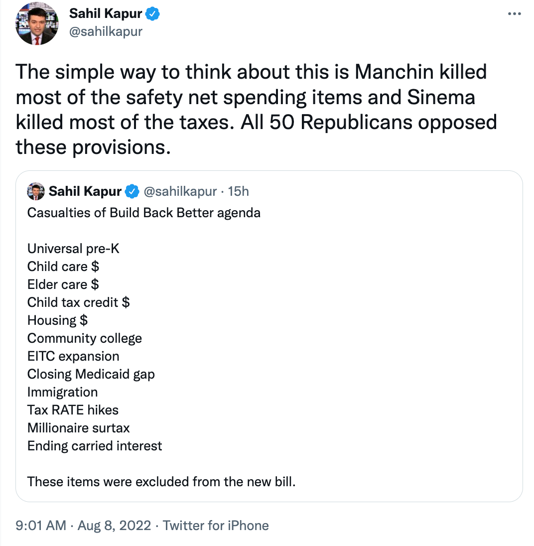 Unlike the $1.9 trillion American Rescue Plan (ARP) that democrats passed in March 2021, the IRA is fully “paid for.” Actually, because of Senator Manchin, it is more than “paid for,” meaning that it is expected to reduce the deficit by around $300 billion over the next decade. Democrats—and many economists—maintain that the legislation will help to bring down inflation, in part of the deficit reduction. I’ll have more to say about that in an upcoming post. For now, I just want to quickly reflect on how this all played out.