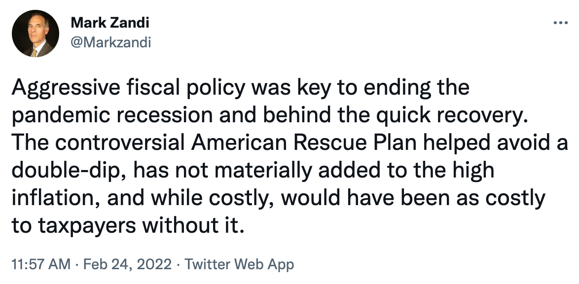 In other words, the much-maligned $1.9 trillion fiscal package that supposedly got us into this mess is barely adding to inflation. Mark Zandi agrees: